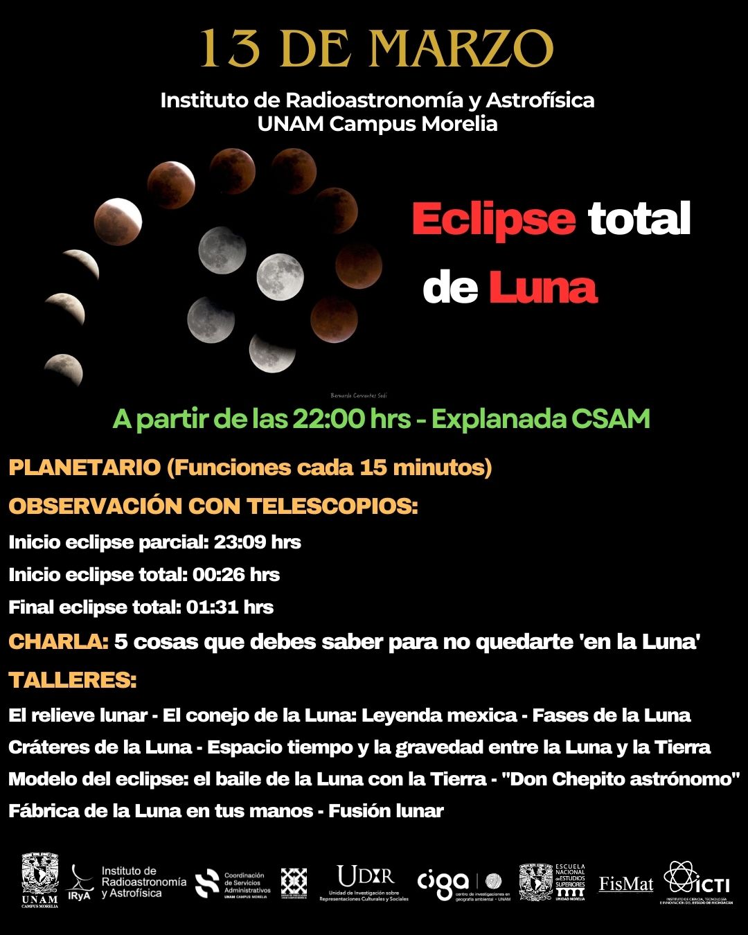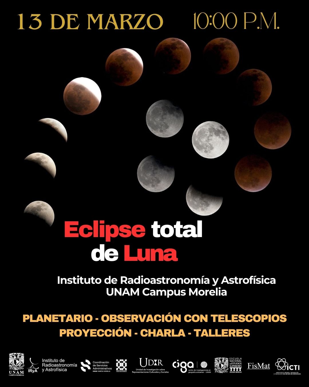 El eclipse lunar será visible el próximo jueves 13 de marzo del 2025, motivo por el cual el Instituto de Radioastronomía y Astrofísica de la UNAM (IRyA) Campus Morelia realizará una serie de actividades gratuitas que incluyen, observación de la llamada «luna roja».